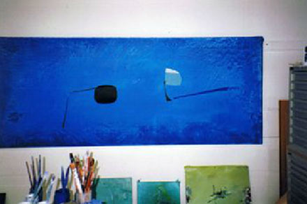 Expose à la galerie Jonas, à Cortaillod. Recherches de formes pour un grand tableau bleu (demeuré inachevé) en procédant à des collages provisoires.